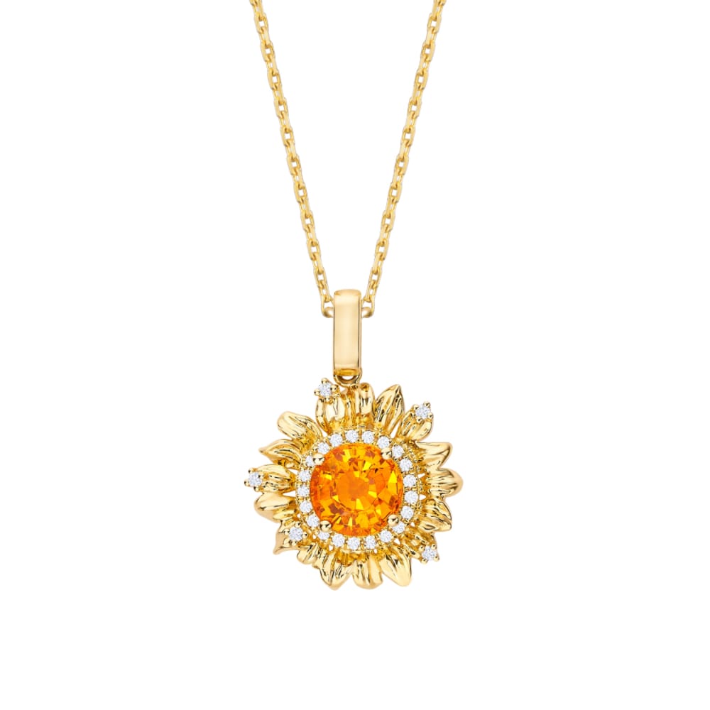 Description: Little Sun – Monet – Premium – Natural Spessartite Pendant Necklace in 18K( Yellow) Gold (Sunflower Design)